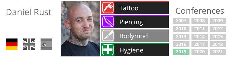 Daniel Rust ist Tätowierer und Piercer seit 9 Jahren. Er ist Inhaber von Tattoo Snake Skin in Hanau. Die Eröffnung des 2. Studios ist bis Ende dieses Jahres abgeschlossen. Hygiene und Qualität sind 2 große Kernpunkte im Bereich des Studiomanagements, mit denen er sich alltäglich beschäftigt. Zur Weiterbildung hat er 2018 die Ausbildung zum Qualitätsmanagementbeauftragten IHK und Anfang 2019 die Ausbildung zum staatlich geprüften Desinfektor abgeschlossen.