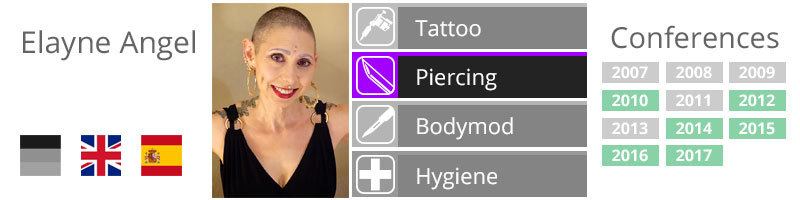 She was founder and President of Rings of Desire, Inc. in the French Quarter of New Orleans, where she pierced for over twelve years. She helped legislators to promulgate the regulations on body art for the state of Louisiana. Following the devastation of Hurricane Katrina, Elayne closed her business and relocated to the Yucatán in Mexico. As a Business Member at Large, she travels the U.S. doing piercings at quality studios; she also writes the monthly “Ask Angel” column for body art industry publication, Pain Magazine.