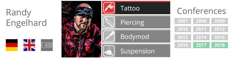 Randy Engelhard, bekannt durch seine Realistik Arbeiten aus aller Welt. Zudem Juror der Tv Show Pain and Fame und Artist der Tv Show Horror Tattoos (Staffel 1-3). Tattooartist seit 2001. Neben dem Tätowieren malt er auch (Ölmalerei) und ist zudem bekannt als Gründer der Tattoo Expo Zwickau, der Lifestyle Passage, des Heaven of Colours Zwickau, sowie dem Tattoo Summer Camp/ Winter Camp.